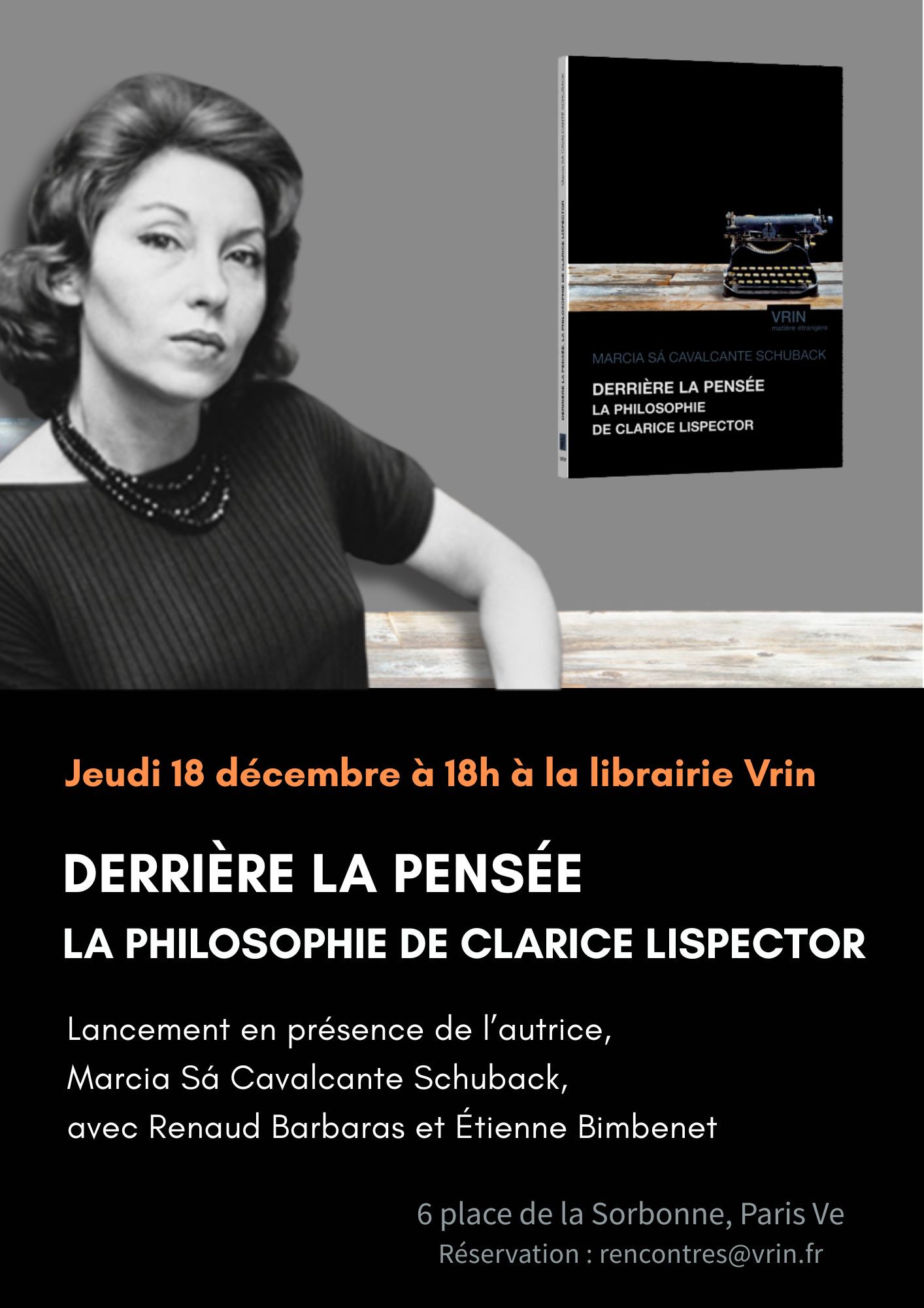 Derrière la pensée est un essai sur la pensée d'une figure majeure de la littérature brésilienne du XXe siècle, Clarice Lispector (1920-1977). La soirée de lancement aura lieu le jeudi 18 décembre à 18h à la librairie Vrin, en présence de l'autrice brésilienne Marcia Sá Cavalcante Schuback, professeure de philosophie à l’université de Södertörn (Suède), du traducteur Renaud Barbaras et du codirecteur de la collection « Matière étrangère », Étienne Bimbenet. Venez en nombre !