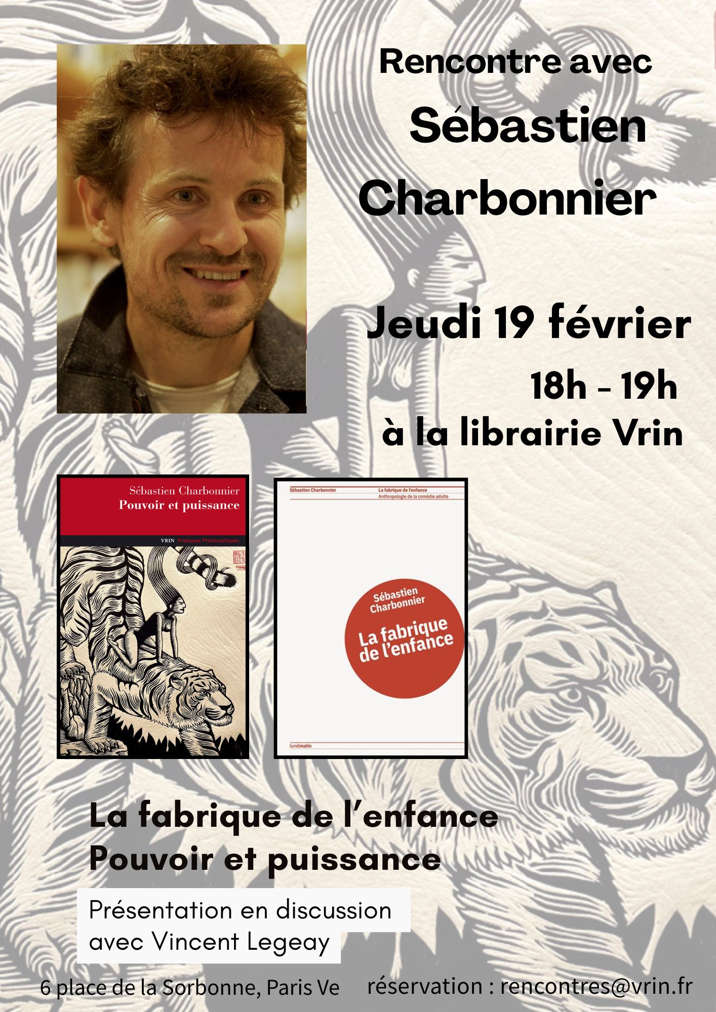 Sébastien Charbonnier présentera le jeudi 19 février 2026 à 18h ses deux derniers livres, Pouvoir et puissance (Vrin, 2025) et La fabrique de l'enfance (lundi matin, 2025). Il sera accompagné de Vincent Legeay qui ouvrira la discussion, avant un échange avec le public.